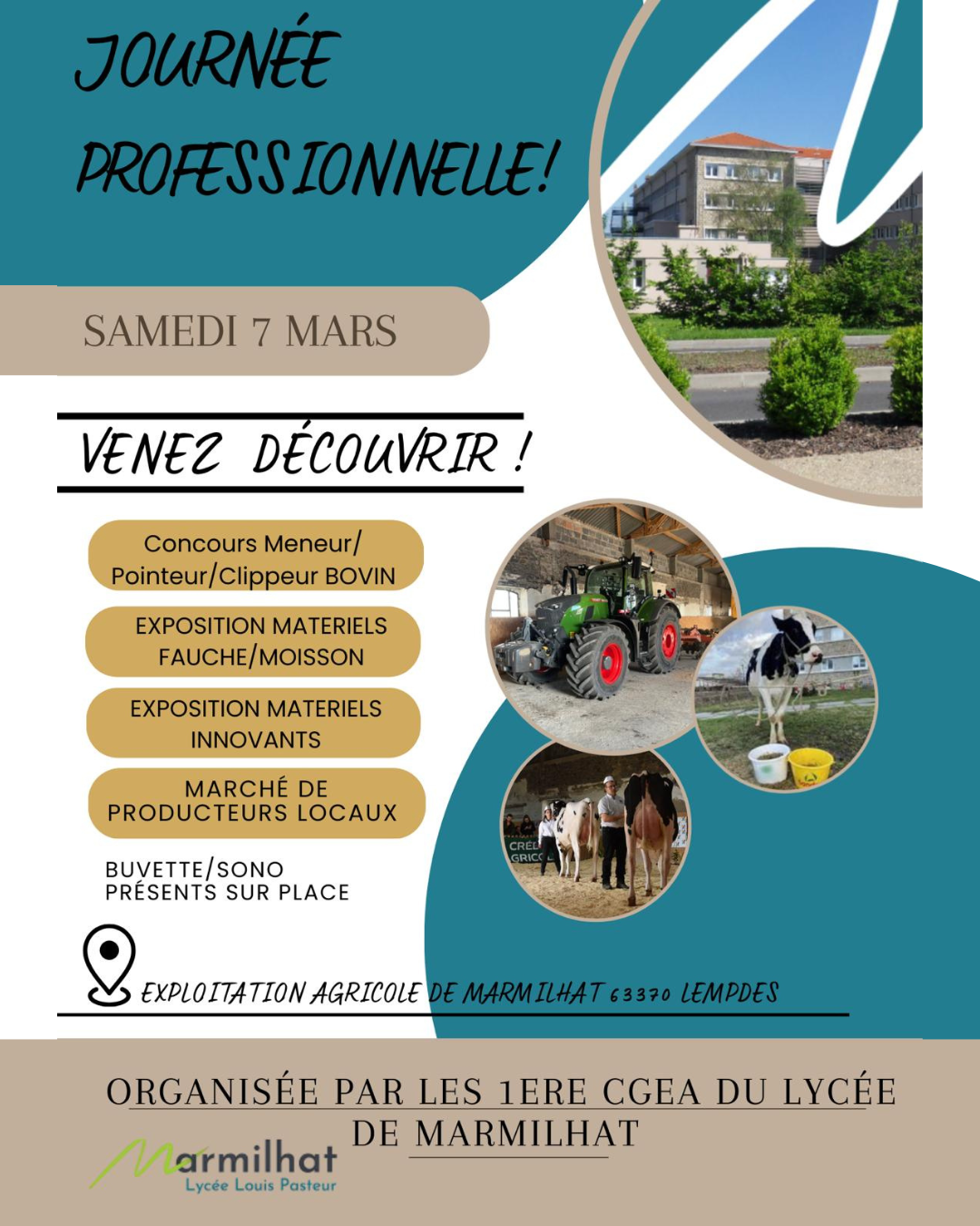 Le samedi 7 mars, l’Exploitation agricole de Marmilhat à Lempdes accueillera une Journée Professionnelle organisée par les élèves de 1ère CGEA du Lycée de Marmilhat, dans le cadre de la Journée Portes Ouvertes.