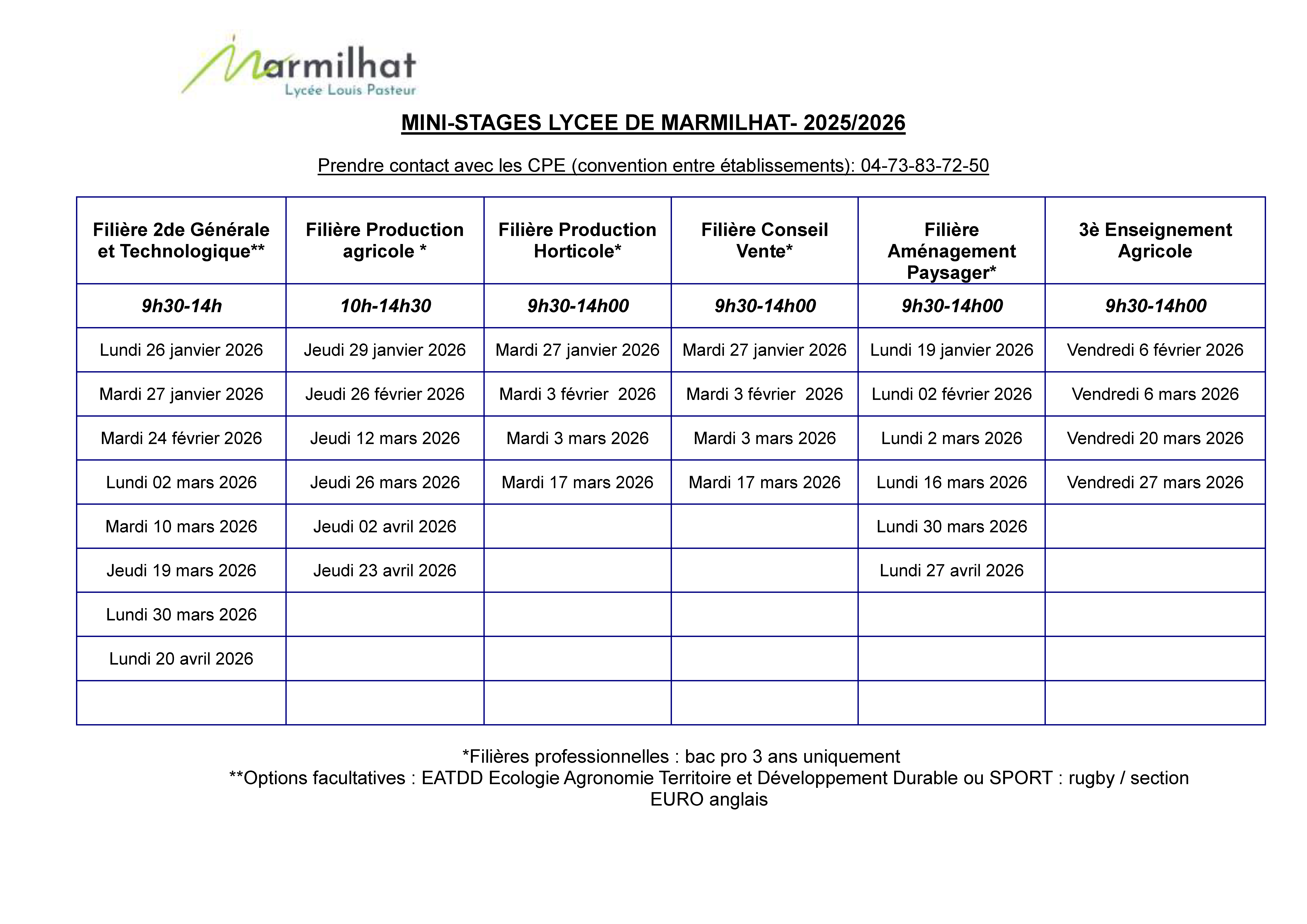 Lycée Louis Pasteur : Vous avez la possibilité d'effectuer un mini-stage. Vous trouverez les dates dans le tableau ci-dessous.