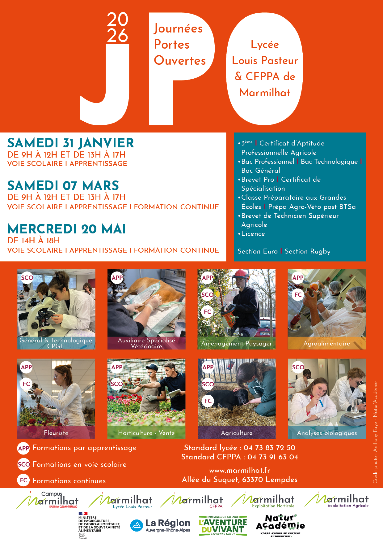 CFPPA de Marmilhat : Vous avez la possibilité d'effectuer un mini stage. Votre collège d'origine doit contacter la personne en charge des Mini-stage au sein du CFPPA afin d'établir une convention et de définir une date.